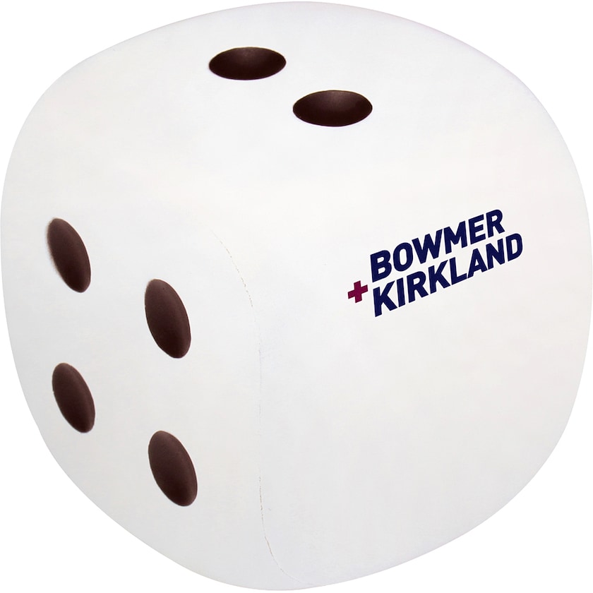 Stressball in Form eines Würfels. Der Druck wird auf der Seite platziert, wo normalerweise die Eins wäre (daher fehlt diese). Der Druck ist von höchster Qualität.