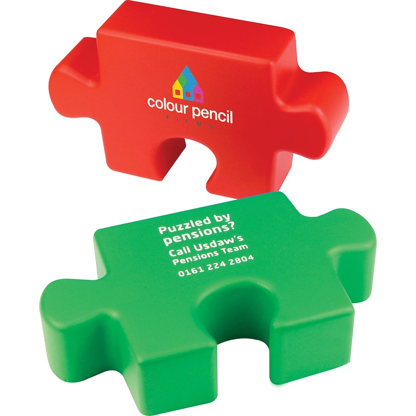 Stressball in Form eines Puzzlestücks. Wählen Sie zwischen den Farben Rot, Grün, Blau, Gelb und Weiß. Der Druck ist von höchster Qualität und hält einer langfristigen Nutzung stand.