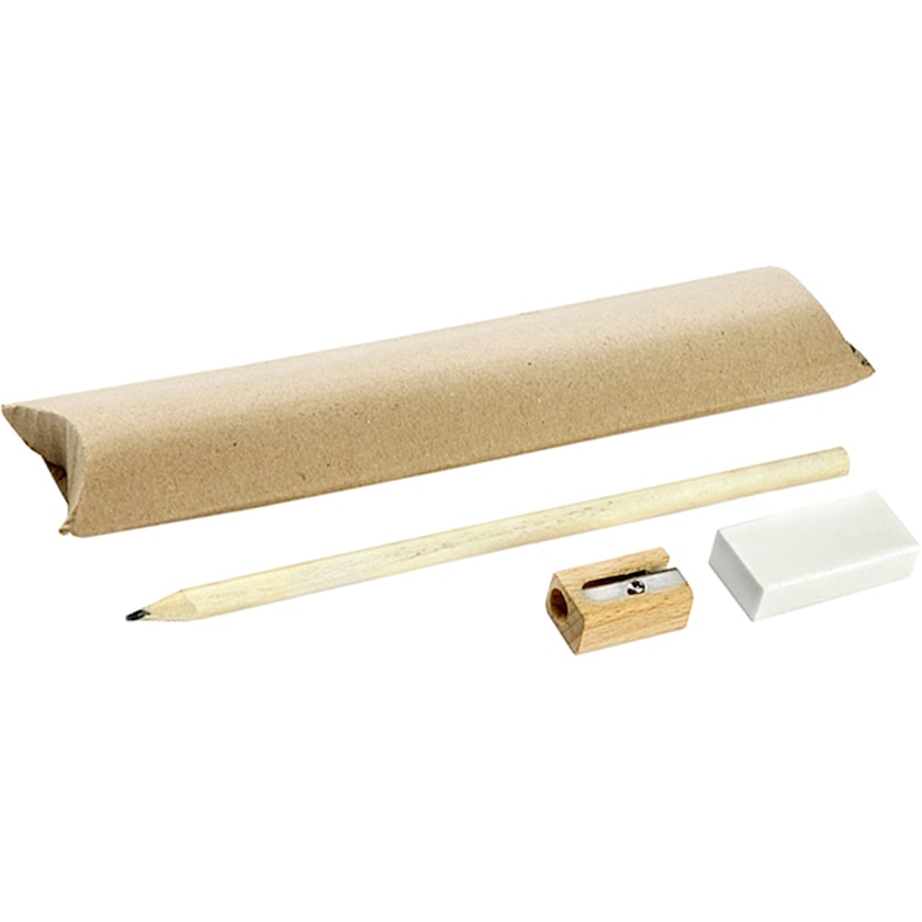 Kleines Set enthält Bleistift, Radiergummi und Anspitzer. Bleistiftset kommt in naturfarbener Papierhülle.