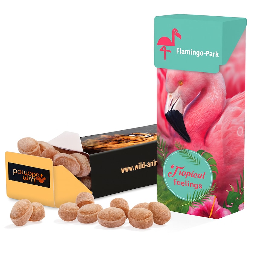 Moderne Bonbonschachtel, gefüllt mir 25 Gramm hochwertigen Süßigkeiten. Die Schachtel wird mit Digitaldruck versehen, und sie bekommt eine schützende Cellophanhülle. Sie designen die Schachtel selbst! (siehe Druckschablone).