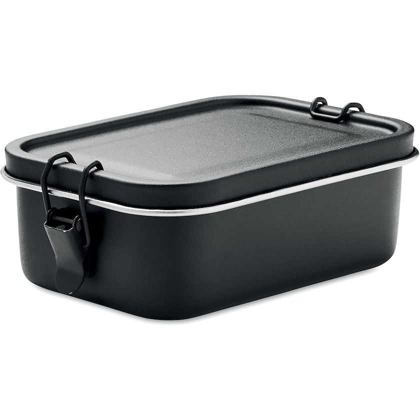 Schwarze Lunchbox aus Edelstahl. Im Inneren befindet sich eine Trennwand, die verhindert, dass sich die Lebensmittel vermischen. Eine stilvolle Lunchbox von hoher Qualität.