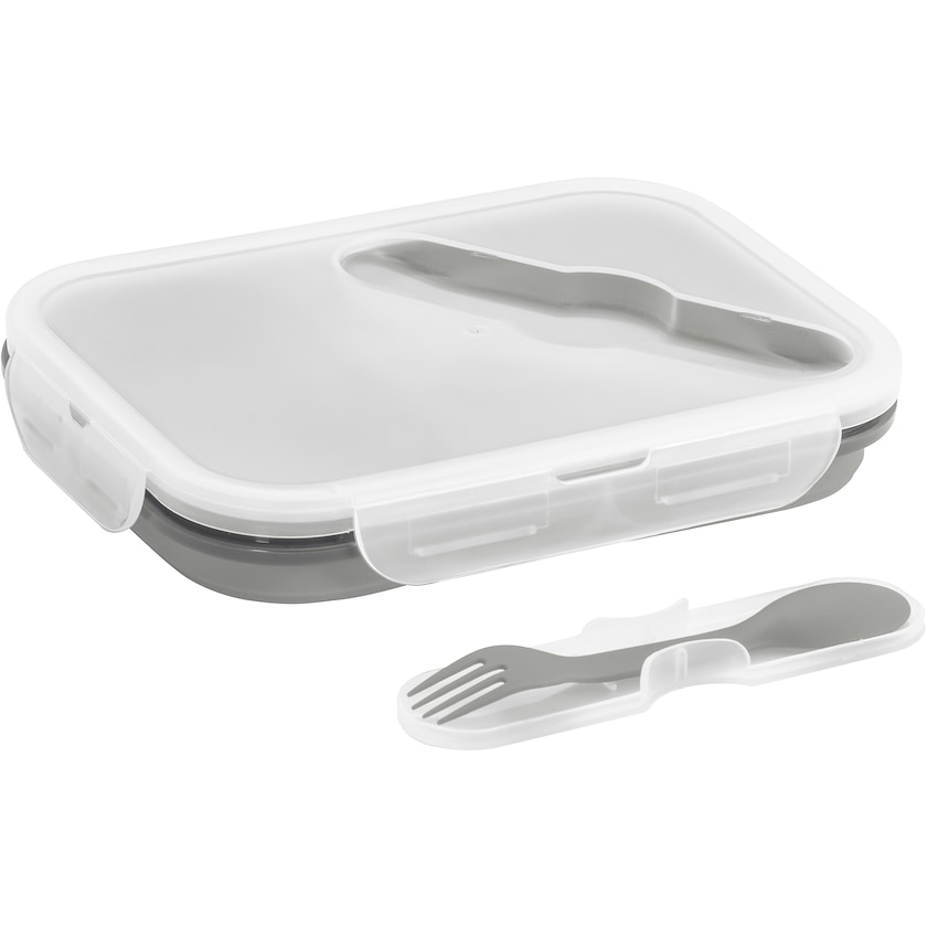 Ausdehnbare Lunchbox mit zwei Fächern. Die beiden Fächer fassen 0,76 respektive 0,48 l. Löffel und Gabel in einem gehen in den Kauf mit ein. Wenn der Deckel entfernt wird, kann die Lunchbox im Mikrowellenherd erwärmt werden.