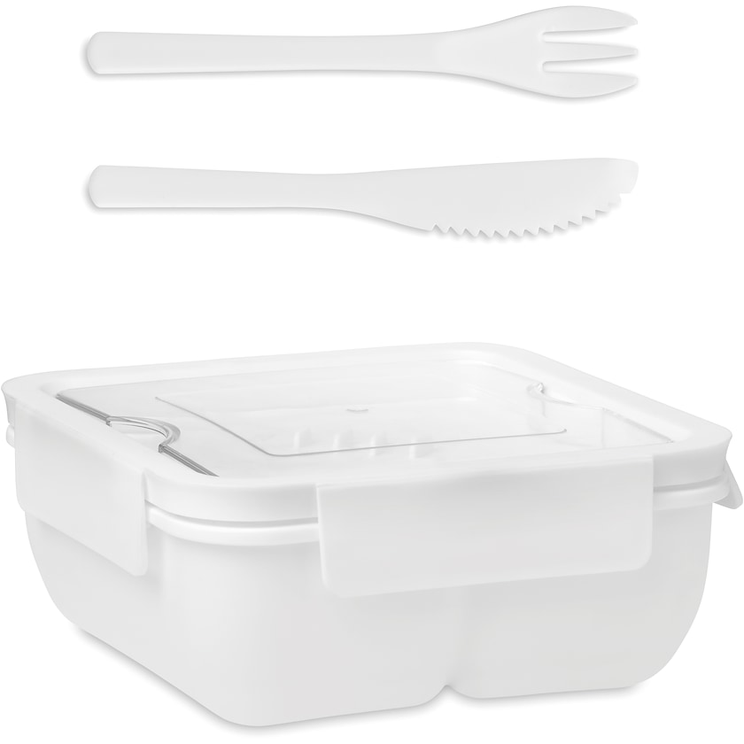 Lunchbox mit zwei Fächern und dazugehörigem Besteck. Das Besteck kann bei Nichtgebrauch am Deckel befestigt werden. Perfekt für alle, die gerne ihr Mittagessen zur Arbeit mitbringen.