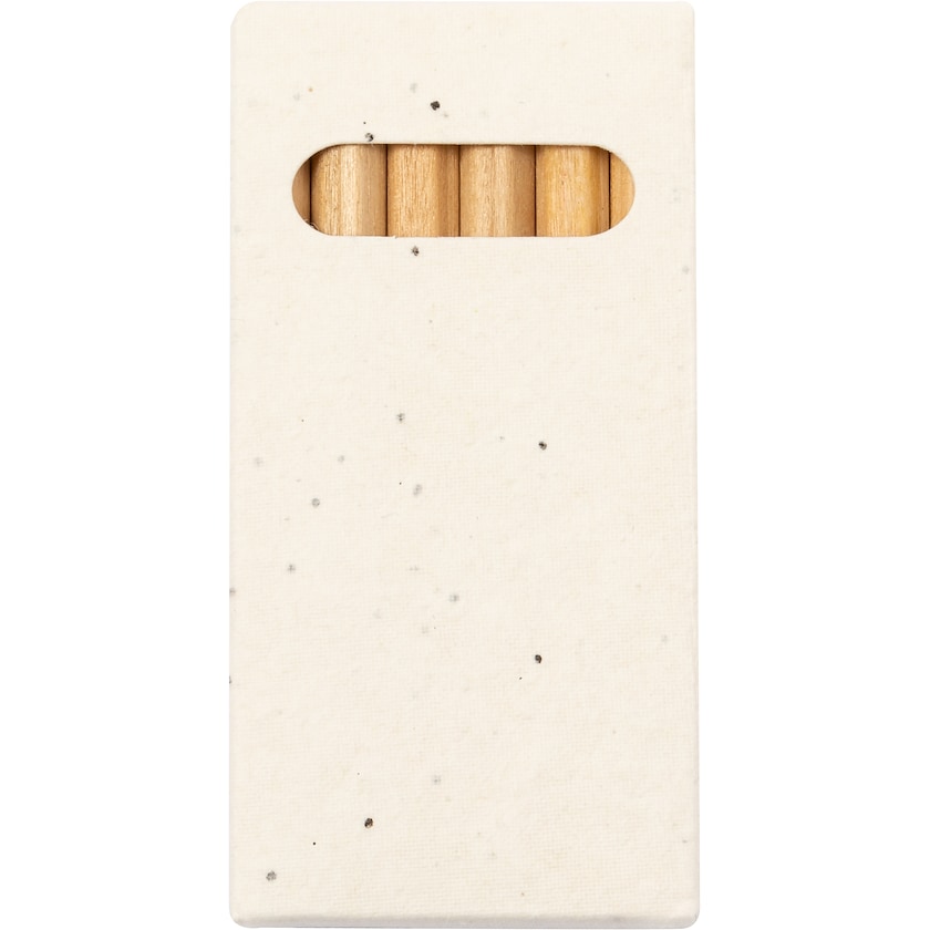 6 Buntstifte in einer Verpackung aus Saatpapier. Sind die Stifte aufgebraucht, kann die Packung eingepflanzt werden und bringt wunderschöne Petunien in gemischten Farben hervor.