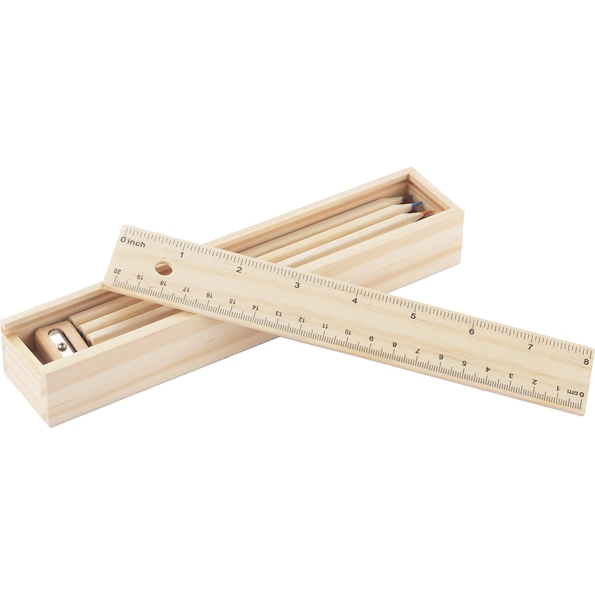 Set mit 12 Buntstiften, Lineal und Radiergummi. Markierung erfolgt auf dem Lineal.
