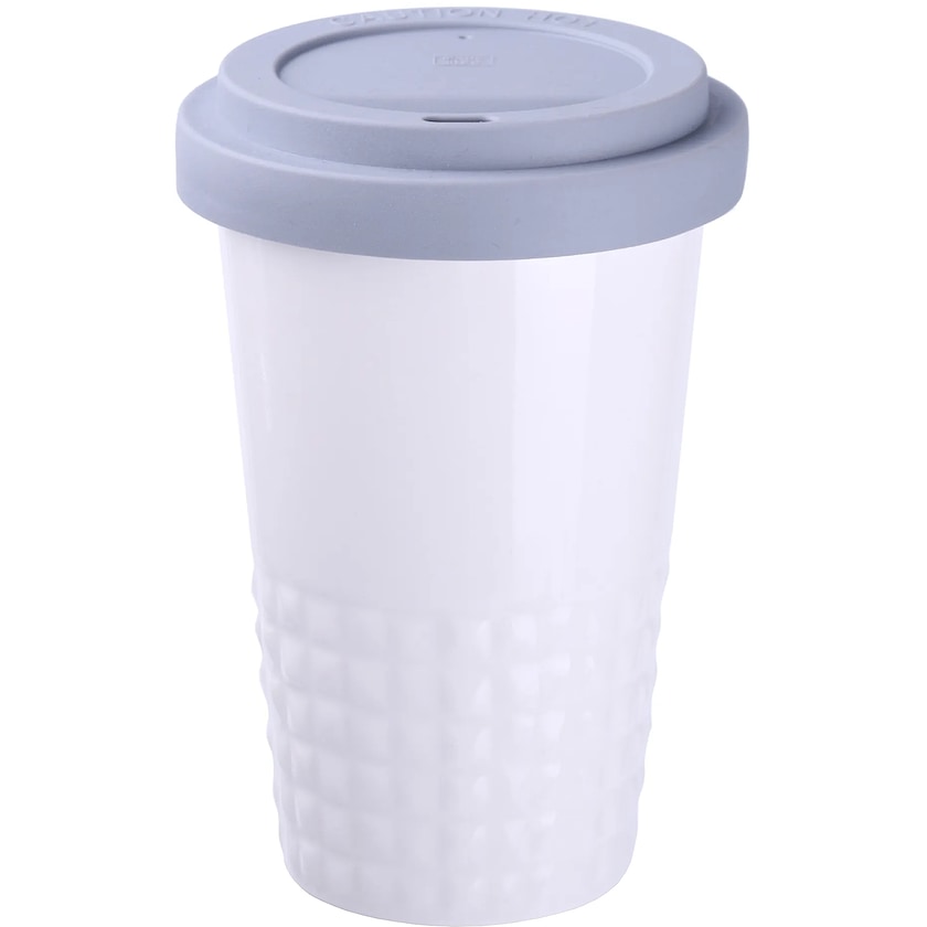 Formschöner Porzellanbecher zum Mitnehmen mit Gummideckel. Der Boden der Tasse hat ein charakteristisches Muster, das angenehm in der Hand liegt. Dank Doppelwänden bleibt Ihr Getränk lange warm.