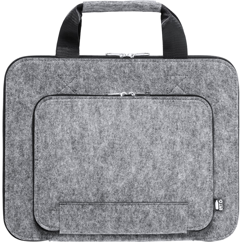 Luxuriöse Dokumententasche aus umweltfreundlichem Filzmaterial. Der Stoff besteht aus rPET, also recycelten PET-Flaschen. Die Tasche hat zwei Staufächer mit Reißverschluss.