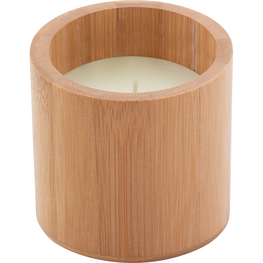 Duftkerze aus Wachs in einem Bambusbehälter. Die Duftkerze verströmt einen angenehmen Duft nach Vanille. Wird in einer naturfarbenen Kartonschachtel geliefert.