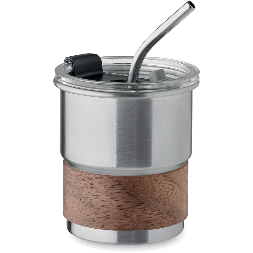 Metallbecher mit Strohhalm und Griff aus Akazienholz. Der Donau Becher ist einfachwandig, gefertigt aus 90% recyceltem Edelstahl und auslaufsicher.