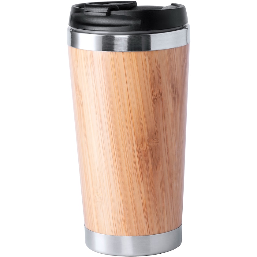Metallbecher aus rostfreiem Stah, außen mit echtem Bambus. Der Becher fasst 45 cl und die Lieferung erfolgt in einer Geschenkverpackung. Das Logo wird aufgelasert.