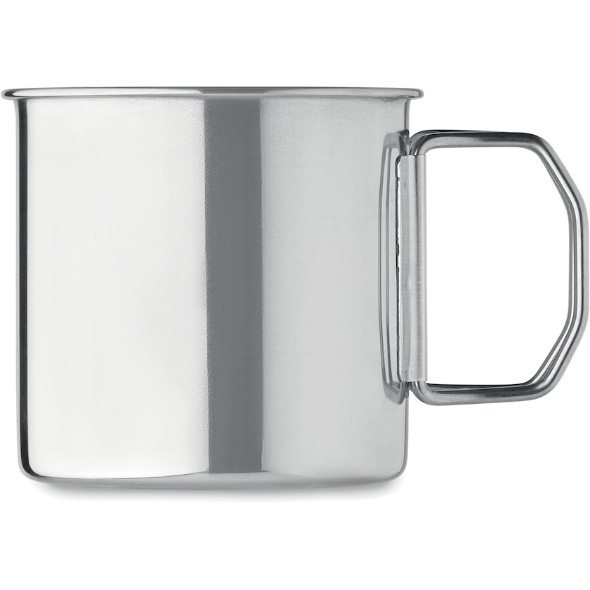 Metallbecher aus Edelstahl mit klappbarem Griff. Jonestown hat einfache Wände und fasst 33 cl. Die Markierung erfolgt mittels Lasergravur.