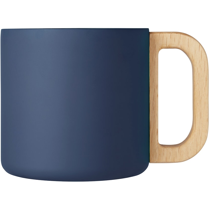 Metallbecher aus recyceltem Edelstahl. Der Becher ist vakuumisoliert, um heiße Getränke länger heiß zu halten. Der Griff ist aus Buchenholz gefertigt.
