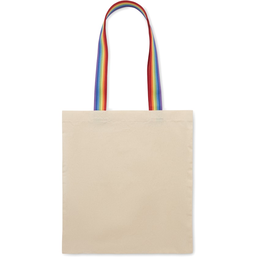 Baumwolltasche mit regenbogenfarbenen Griffen. Gefertigt aus robuster 180 g/m² Baumwolle. Tragfähigkeit bis 2,5 kg.