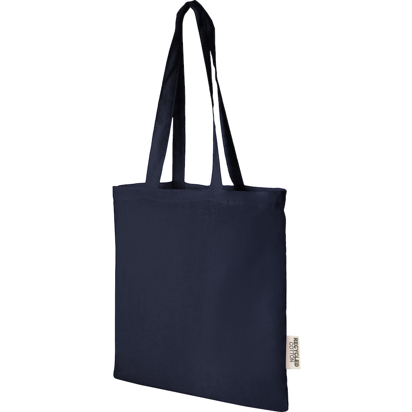 140 Gramm schwere Baumwolltasche aus GRS-zertifizierter, recycelter Baumwolle. Die Stofftasche hat 30 cm lange Griffe, mit denen sie leicht zu tragen ist.
