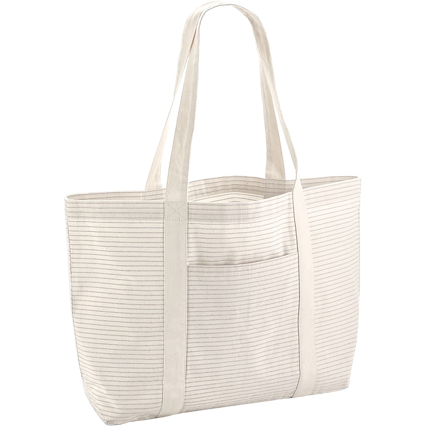 Schöne Baumwolltasche mit gestreiftem Stoff. Die Tasche ist aus einem robusten 200g-Gewebe aus Bio-Baumwolle gefertigt. Auf der Vorderseite befindet sich eine geräumige Tasche. Sie kann über der Schulter oder in der Hand getragen werden.
