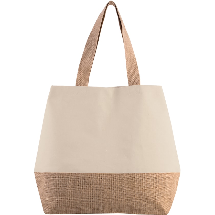 Große Baumwolltasche mit Unterteil aus Jute. Innen befindet sich ein Fach mit Reißverschluss. Der Griff misst 55 cm. Die Tasche hat einen Magnetverschluss.