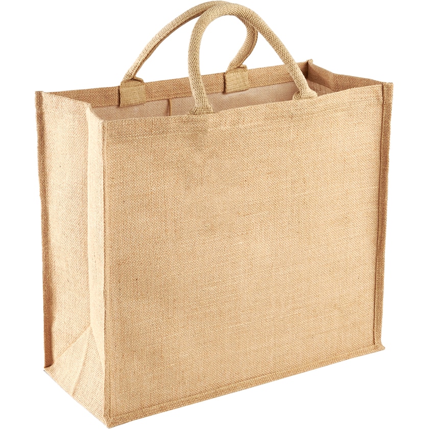 Große Jutetasche aus laminierten Stoff. Die Laminierung macht die Tasche stabiler. Der Griff ist aus Baumwolle und hat eine länge von 37 cm. Die Stickkosten beziehen sich auf maximal 10.000 Stiche. Jute ist ein fantastisches Naturmaterial, das vollständig biologisch abbaubar ist.