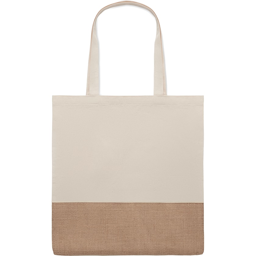 Baumwolltasche mit Jutepatch. Die Stofftasche hat lange Henkel. Eine Stofftasche aus natürlichen Materialien mit viel Charme.