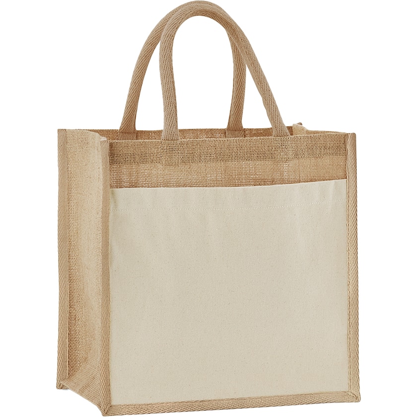 Jutebeutel mit Baumwolltasche auf der Vorderseite. Der Jutestoff ist unlaminiert, was der Tasche eine natürliche Haptik verleiht. Die Griffe sind aus Baumwolle.