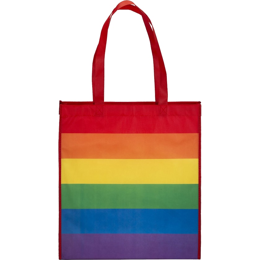 Umweltfreundliche regenbogenfarbene Tasche mit breitem Boden. Dorian wird aus recycelten PET-Flaschen (rPET) hergestellt. Es ist nur ein 1-farbiger Druck möglich.
