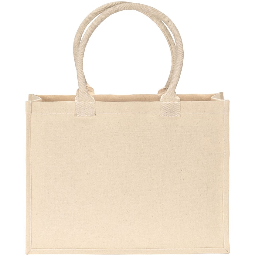 Strandtasche aus laminierter recycelter Baumwolle. Durch den breiten Boden ist die Strandtasche sehr geräumig. Die Henkel sind lang genug, um die Tasche sowohl in der Hand als auch über der Schulter zu tragen.