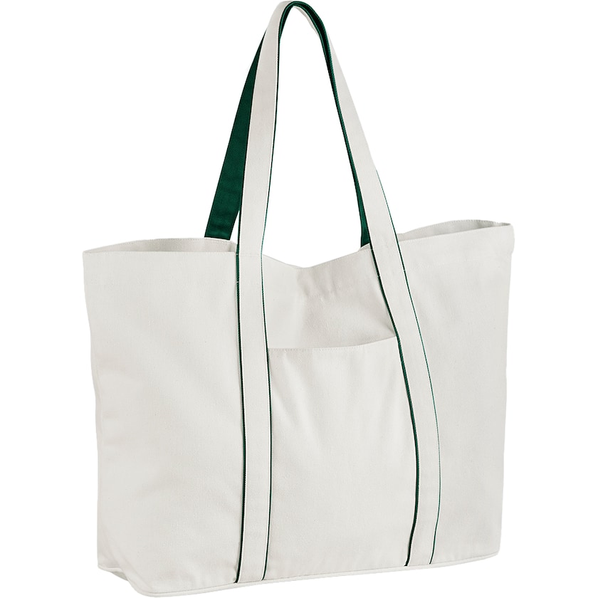 Umweltfreundliche Strandtasche aus robustem Baumwollstoff. Das Hauptfach wird mit einem Magnetverschluss verschlossen. An der Außenseite befindet sich eine versteckte Tasche für Wertsachen. Die Tasche kann sowohl über der Schulter als auch in der Hand getragen werden. Der Stoff wiegt 407 Gramm/m2 und besteht aus 70 % recycelter Baumwolle und 30 % Post-Consumer-Polyester.
