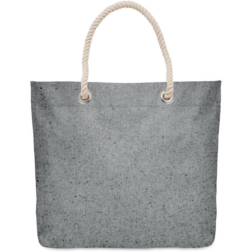 Strandtasche aus recycelter Baumwolle mit starken Kordelgriffen. Der Stoff besteht zu 80 % aus recycelter Baumwolle und zu 20 % aus normaler Baumwolle.