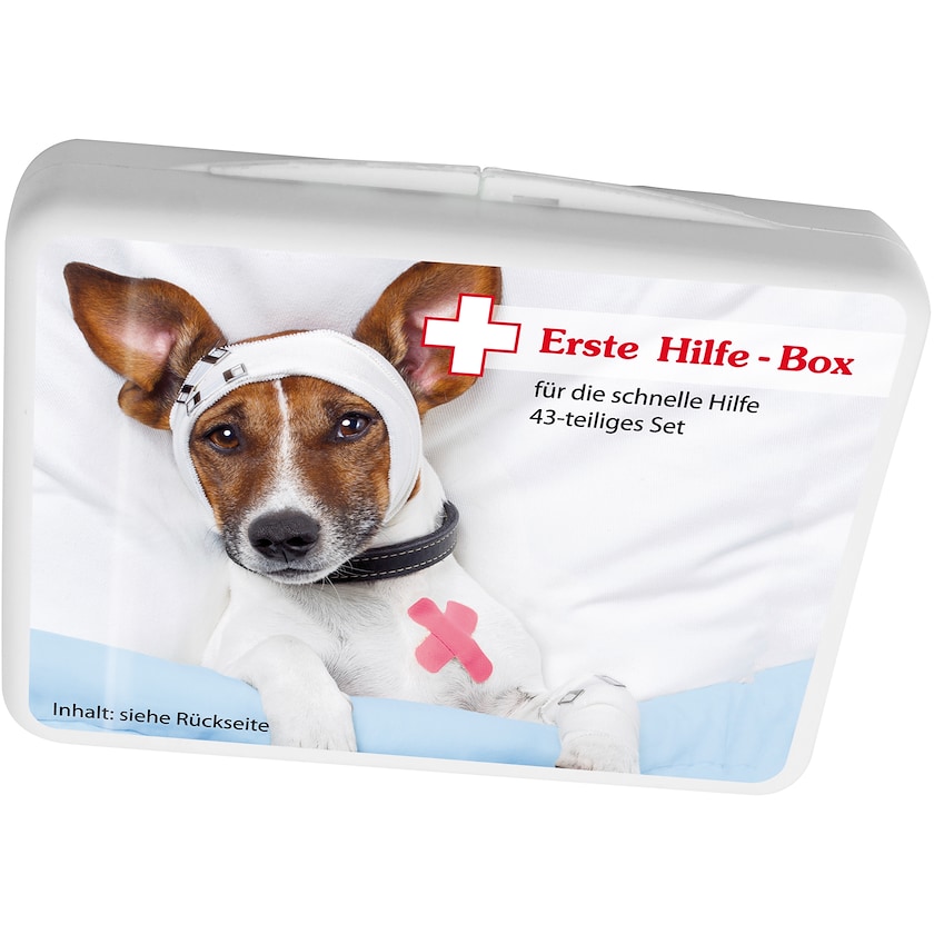 Erste Hilfe Kasten mit Etikett im 4-Farbdruck. Enthält 43 Produkte: 1 x Kompresse 76 x 50 mm, 1 x Klebeband 1,25 cm x 3,3 m, 1 x Pflaster 100 x 50 mm, 10 x Pflaster 72 x 19 mm, 10 x Pflaster 57 x 19 mm, 10 x Pflaster 40 x 10 mm samt 10 x runde Pflaster 22 x 22 mm. Auf der Rückseite gibt es ein Etikett mit einer Inhaltsübersicht.