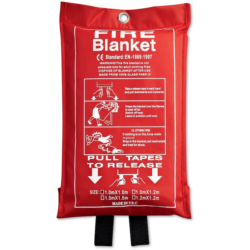 Löschdecke aus Glasfaser. Dieses Werbeprodukt kann Leben retten! Die Löschdecke hat eine englische Gebrauchsanweisung auf der Verpackung.