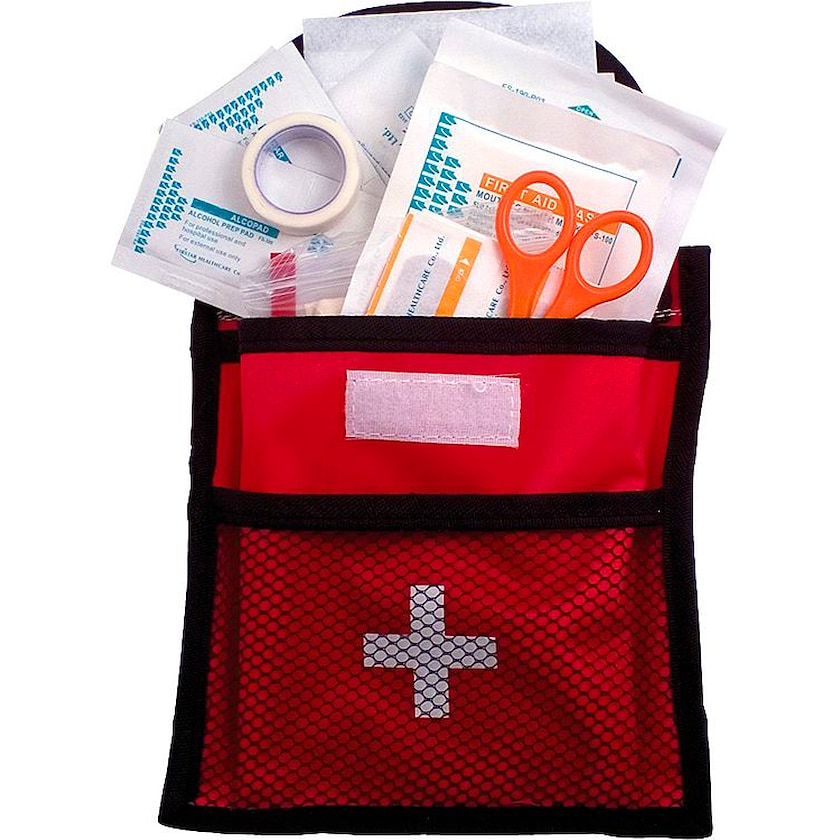 10 Pflaster, Augenkompresse, 1 breites Pflaster (7 x 20 cm), 3 Wundseifen, 1 Schutzmaske für Mund-zu-Mund-Beatmung, 1 Dreieckstuch, 2 x Druckverband, 1 Schere, 1 Klebeband, 1 Pinzette, Sicherheitsnade