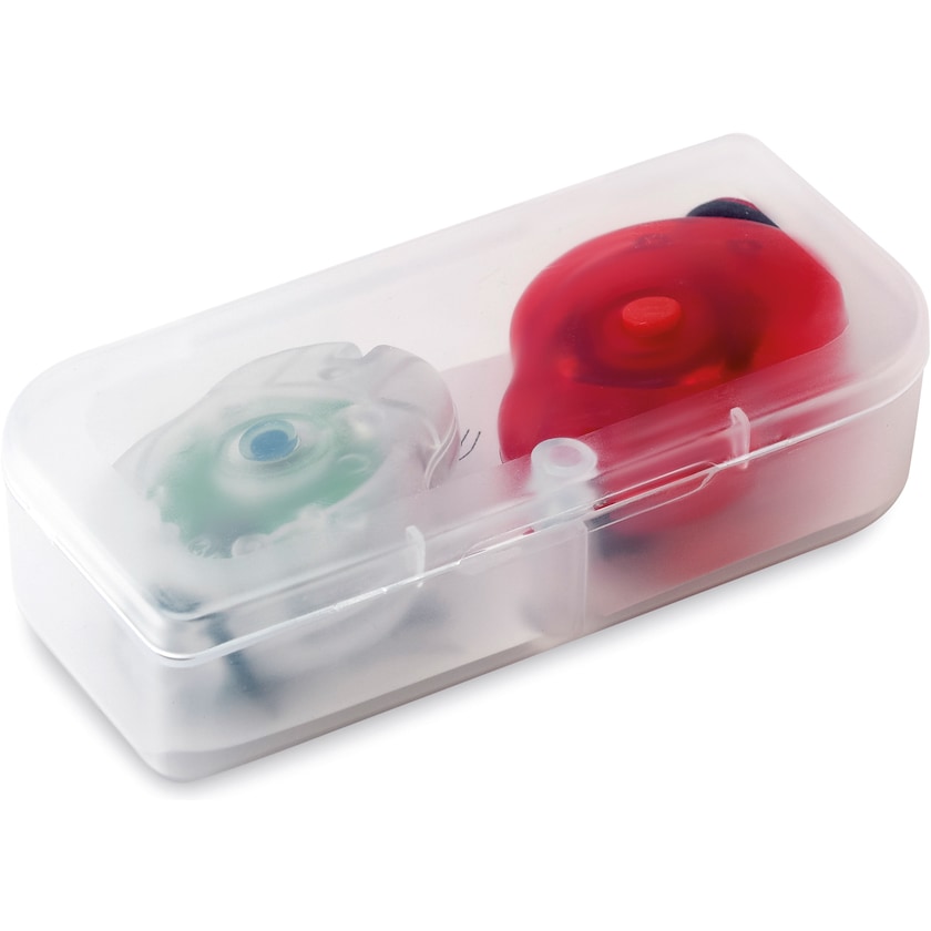 Set mit Fahrradbeleuchtung. Das Set enthält sowohl Front- als auch Rücklicht. Die Fahrradbeleuchtung wird mit zwei Knopfbatterien (im Lieferumfang enthalten) betrieben. Geliefert in einer matten Kunststoffbox. Gedruckt wird auf die Kunststoffbox.