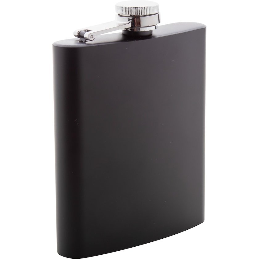 Schwarzer Flachmann aus Edelstahl. Frederick fasst 20 cl und hat somit eine praktische Größe. Die Beschriftung erfolgt mit Lasergravur.
