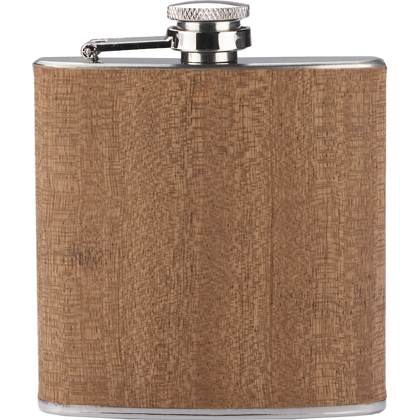 Flachmann aus Edelstahl mit Verkleidung aus Echtholz. Der Flachmann fasst 20 cl. Wählen Sie zwischen Druck und Lasergravur.