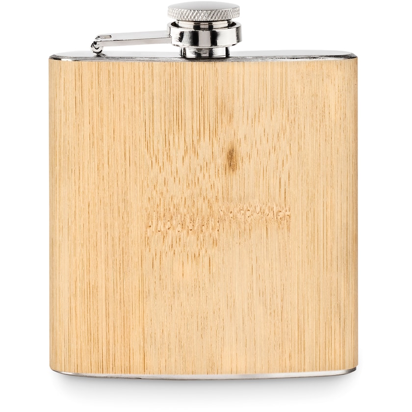 Flachmann aus Edelstahl und Oberfläche aus Bambus. Ein eleganter Flachmann mit natürlicher Schönheit. Die Markierung erfolgt mittels Lasergravur.