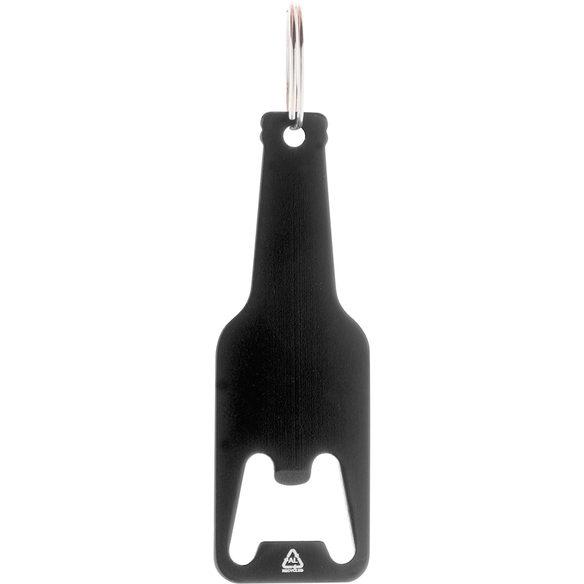 Flaschenöffner in Form einer Flasche aus recyceltem Aluminium. Perfekt für den Schlüsselanhänger. Man kann diesen nach Wunsch bedrucken oder lasergravieren.