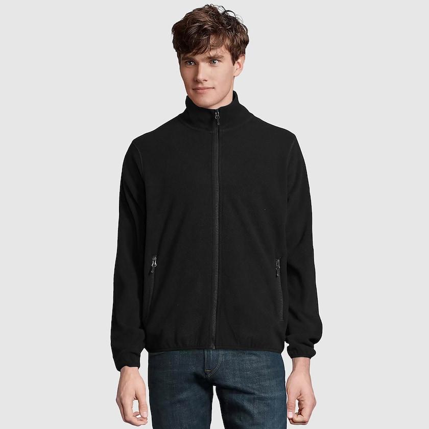 Umweltfreundlicher Fleecepullover für Herren, der ab 5 Stück erhältlich ist. An den Seiten befinden sich Reißverschlusstaschen. Der Stoff besteht zu 100% aus recyceltem Polyester.