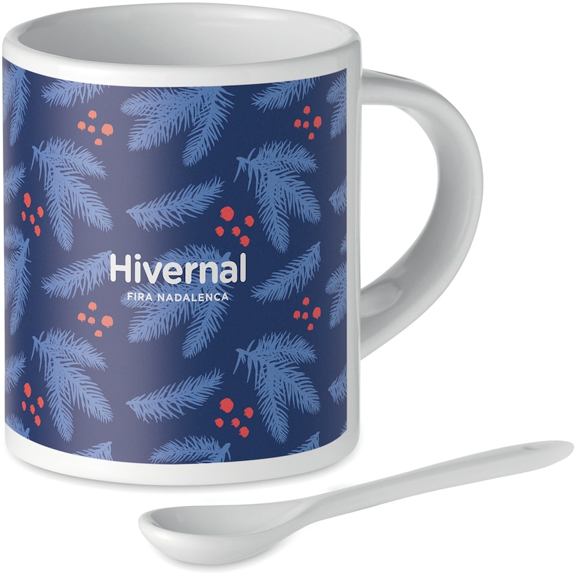 Fototasse mit dazugehörigem Löffel. Der Becher hat eine große Druckfläche, die gute Möglichkeiten bietet, eine effektive Werbebotschaft zu vermitteln. Der Löffel wird bei Nichtgebrauch im Griff des Bechers aufbewahrt.