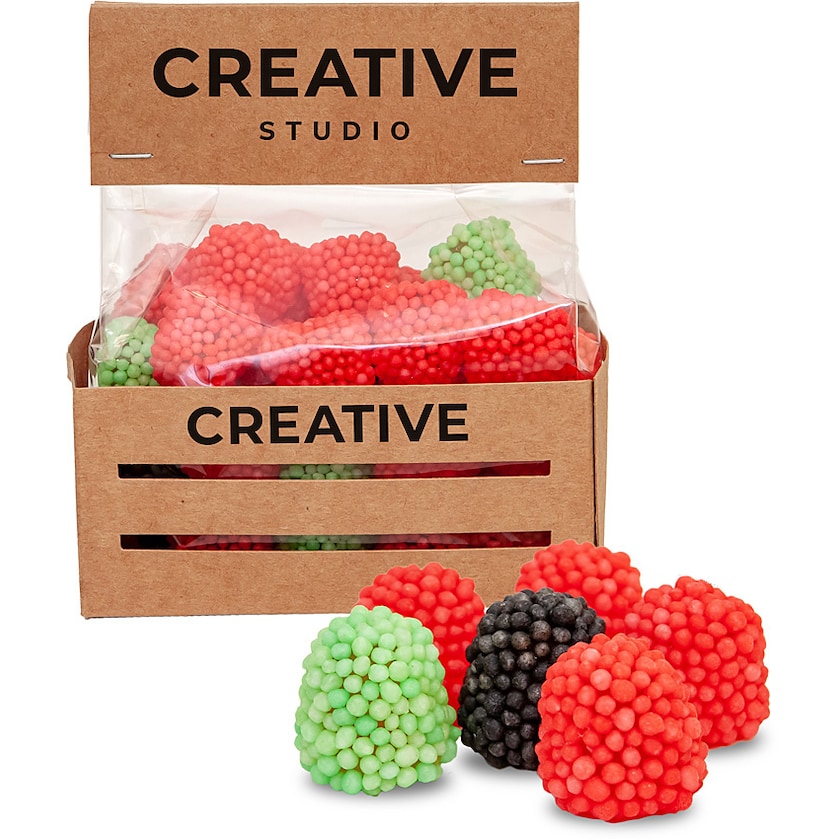 Fruchtgummibonbons in Himbeerform. Geliefert in einer Verpackung aus naturfarbenem Papier. Laden Sie die Druckvorlage herunter und gestalten Sie die Verpackung ganz einfach selbst. Wenn Sie Hilfe benötigen, helfen wir Ihnen gerne weiter.