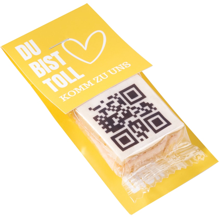 Digital bedruckter Keks, individuell gestaltbar, auf einer Werbekarte angebracht. Erhältlich in verschiedenen Geschmacksrichtungen. Der Keks wird mit essbarer Karamellfarbe auf einer feinen Zuckerschicht bedruckt. Die beiliegende Karte (178 × 55 mm) lässt sich digital und individuell nach Ihren Designwünschen bedrucken.