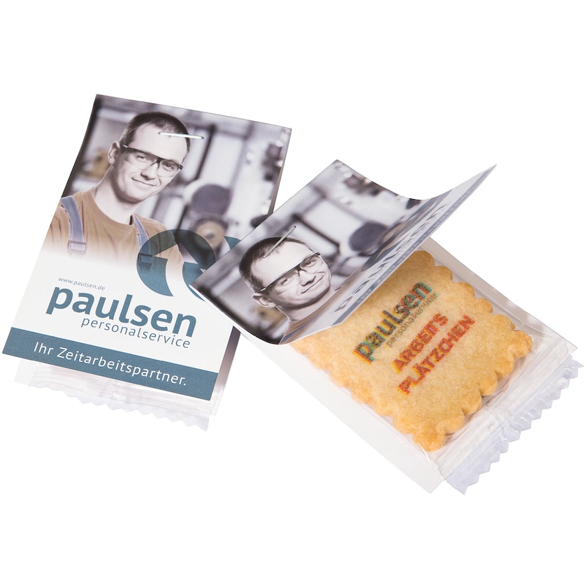 Butterkekse mit Karte samt 4-Farbdruck. Die Butterkekse haben einen wunderbaren Vanillegeschmack. Sowohl die Außenseite der Karte als auch die Oberseite der Kekse sind 4-farbig bedruckbar. Die Kekse werden mit Karamellfarbe bedruckt. Eine lustige und geschmackvolle Art Werbung zu machen!