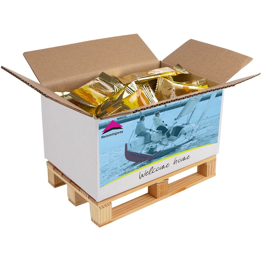 Umzugskarton auf Holzpalette gefüllt mit 60 Keksen. Die Kekse sind in goldfarbene Folie eingewickelt. Der Umzugskarton wird an jeder Längsseite mit zwei 4-farbig bedruckten Etiketten versehen.