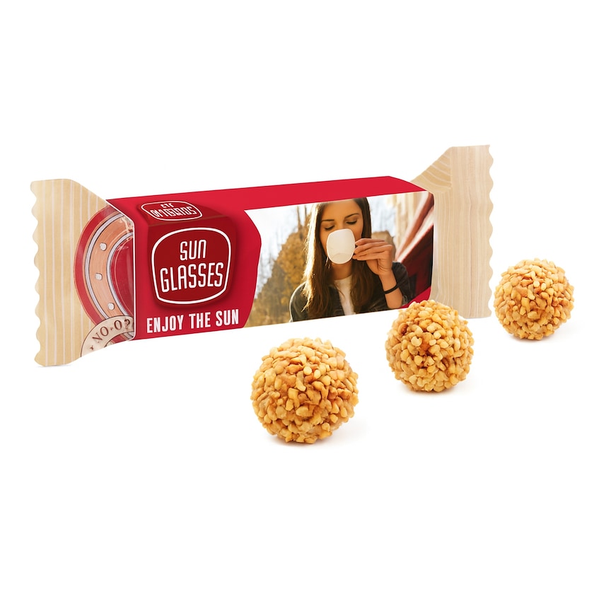 3 leckere Haselnusskugeln von Giotto. Der Druck erfolgt auf einer Papierhülse, die um die Originalverpackung kommt.