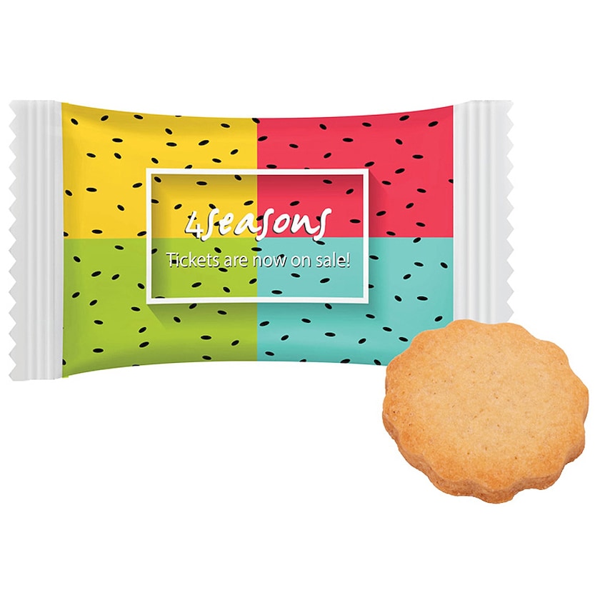 Leckerer Keks im Flowpack. Die ganze Verpackung wird nach Ihren Wünschen bedruckt. Perfekt zum Kaffee!