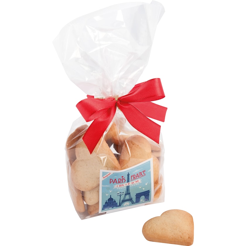 Herzförmige Butterkekse in einer Tüte mit Schleife. Auf der Tüte wird ein Etikett mit 4-Farbdruck angebracht. Wählen Sie bei der Schleife zwischen braun, blau und rot.