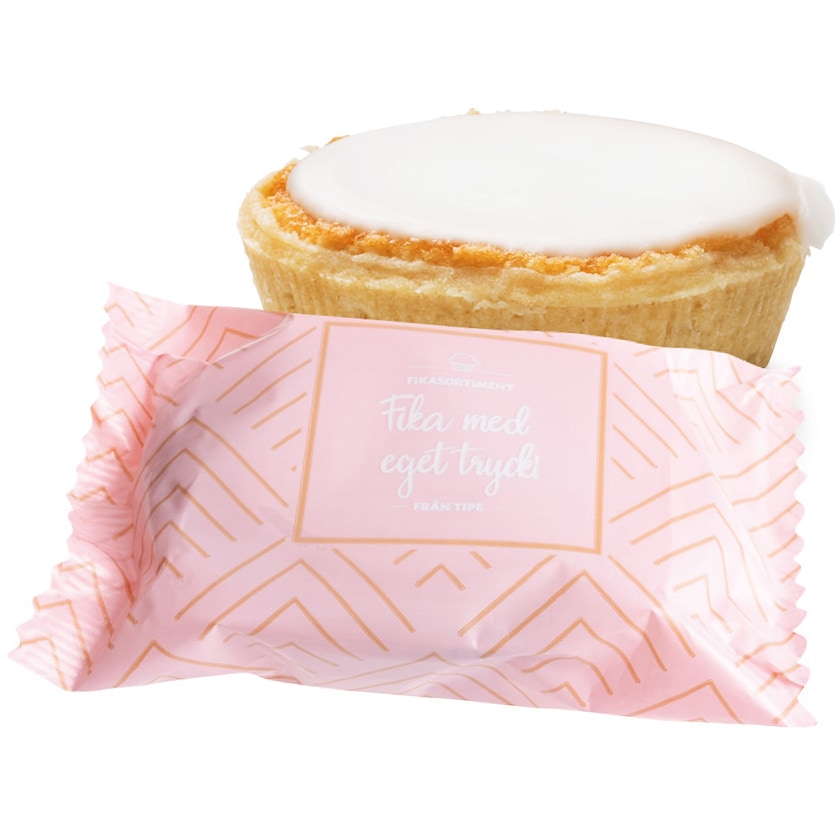 Großes Mazarin in einer Verpackung mit Logo bedrucken. Der Kuchen besteht aus Mürbeteig mit einer Mandelfüllung mit einer Glasur. Die gesamte Verpackung wird nach ihrem Wünschen im 4-Farb-Fotodruck bedruckt.