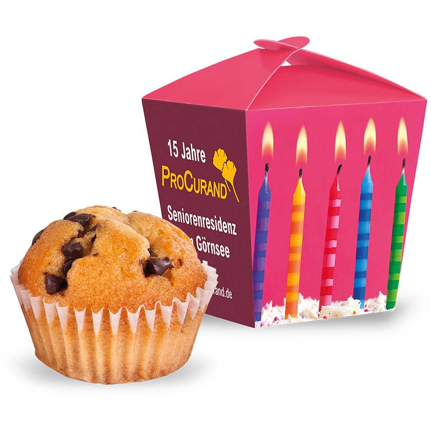 Kleiner Muffin in einer eleganten Pappverpackung. Wählen Sie aus drei verschiedenen Geschmacksrichtungen. Die ganze Verpackung wird nach Ihren Wünschen bedruckt.