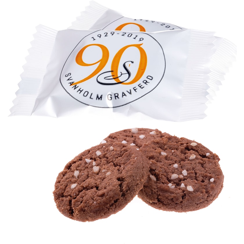 Ein Schokoladenkeks von Nyåkers in einem bedruckten Flowpack. Wählen Sie zwischen den Geschmacksrichtungen Toffee und Schokolade. Eine perfekte Zwischenmahlzeit.