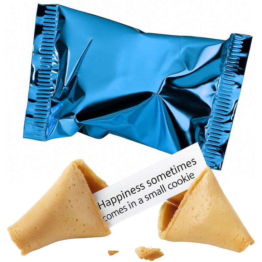 Glückskekse ohne Logo ab 600 Stück. Sie wählen bis zu 5 verschiedene Botschaften, die in den Keksen gefunden werden sollen. Jede Botschaft kann bis zu 125 Zeichen inklusive Leerzeichen haben. Der Text wird in schwarz gedruckt. Auf der silbernen Folie ist kein Druck möglich.