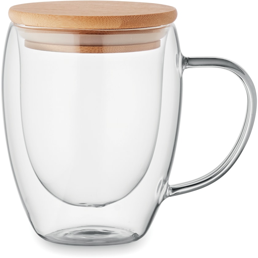 Doppelwandiger Glasbecher mit Bambusdeckel. Dank der doppelten Wände bleibt das Getränk länger warm. Der Druck kann in maximal zwei Farben erfolgen.