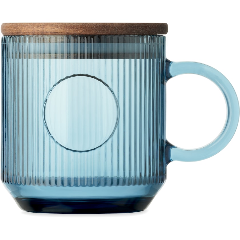 Ansprechend geriffelter Glasbecher mit Holzdeckel. Der Aufdruck befindet sich auf der glatten, kreisförmigen Oberfläche auf der Vorderseite des Bechers. Der Deckel besteht aus FSC-zertifiziertem Akazienholz.